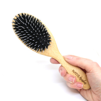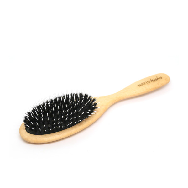 This brush is made in Europe exclusively for our own brand NATIS®. Its lightweight wooden body is ergonomically designed for comfortable use without tiring the hand. The plastic pins penetrate the coat to gently detangle and loosen any knots, while the boar bristles remove dust and dirt and polish the surface of the coat.