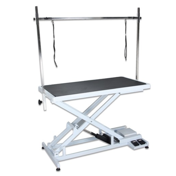 Electric lifting grooming table with foot control and double arm. Stands all breeds of dogs. What makes this table very special is that it goes down extremely low (i.e. only 21 cm high from the ground). It enables to avoid lifting the animal up to the top of the table.