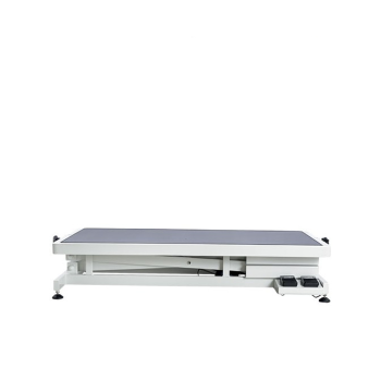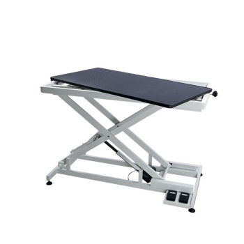 Electric grooming table with rectangular table top (65 x 125 cm). Height variation is 74 cm; low position 21 cm, high position 95 cm.