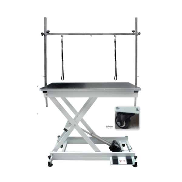 Electric grooming table with rectangular table top (60 x 110 cm). Height variation is 72 cm; low position 29 cm, high position 101 cm.