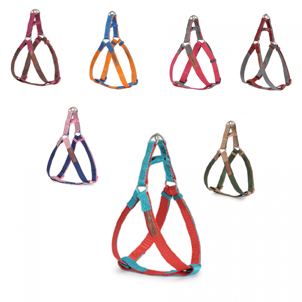 Elegant step-in harness with a combination of two colors, made of durable, soft and washable nylon. Great for everyday use or for sports activities where the dog likes to pull.
