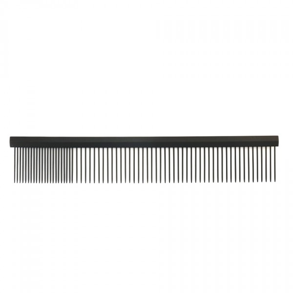A long metal comb with two different densities of teeth is an essential tool for grooming fur and identifying foreign objects within it. Due to its Teflon coating, this comb will not create static in the fur.