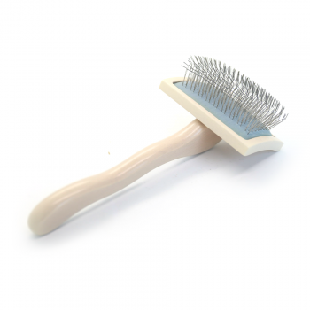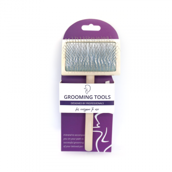 Choose a slicker brush according to the size of the dog and the density and type of hair. SIZE: Larger dogs need larger brushes to reduce brushing time. small dogs smaller brush so you can access all over the body. NEEDLE LENGTH: depending on the density of the fur, you choose the length of the needles that will be long enough to penetrate the dog's fur (e.g. for a spaniel, a medium length of needles is enough, but for a Samoyed you need the longest needles). COAT TYPE: the silkier/softer the coat, the softer the brush you need. If the dog has fringed hair, then you need stronger needles, i.e. a stiffer brush.