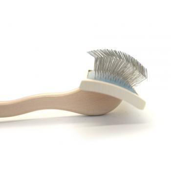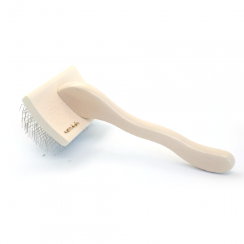 This angular wooden slicker brush is ideal for detangling thick fur. It has a curved head that increases the combing surface and matches our brushing strokes. The L size of the head and the extra long needles, which are clamped in a soft pad, ensure that this brush is not too coarse and therefore does not tear the hair.