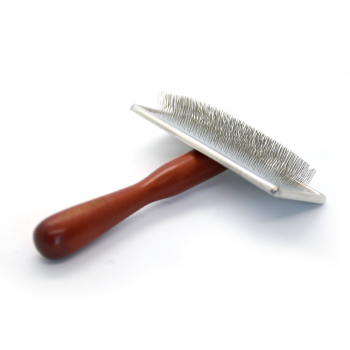 The sturdy needles of this classic slicker brush ensure efficient combing of even harder/fringed hair, while still being soft enough not to damage silky/soft hair. The sufficiently long and pear-shaped wooden handle is comfortable for combing. It is mounted in a metal rectangular head that has a firm pad with short needles.
