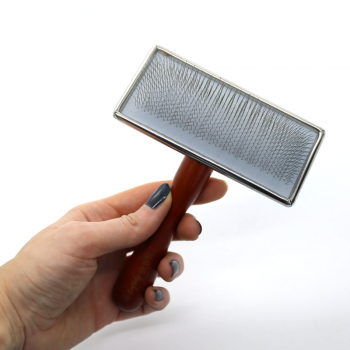 This small slicker brush with medium length firm needles is great for hard to reach or smaller areas, with moderately dense hair. The metal head is thin and flat, so you can comb even hard-to-reach areas.