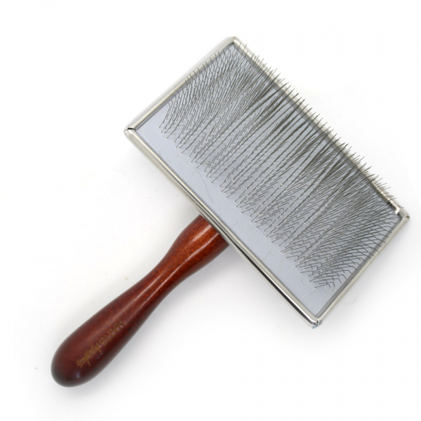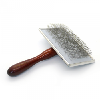 The sturdy needles of this classic slicker brush ensure efficient combing of even harder/fringed hair, while still being soft enough not to damage silky/soft hair. The sufficiently long and pear-shaped wooden handle is comfortable for combing. It is mounted in a metal rectangular head that has a firm pad with short needles.