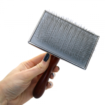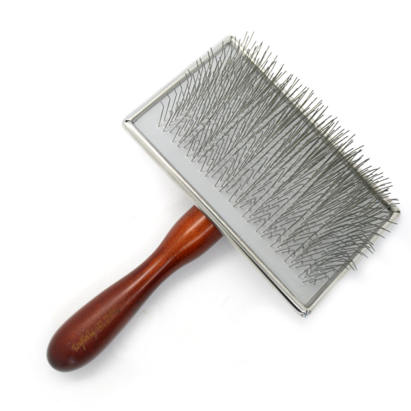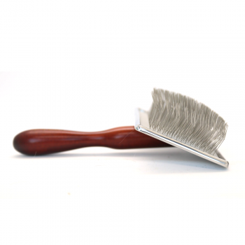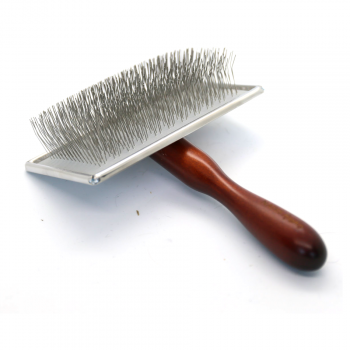 The sturdy needles of this classic slicker brush ensure efficient combing of even harder/fringed hair, while still being soft enough not to damage silky/soft hair. The sufficiently long and pear-shaped wooden handle is comfortable for combing. It is mounted in a metal rectangular head that has a firm pad with short needles.