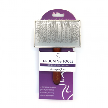 Choose a slicker brush according to the size of the dog and the density and type of hair. SIZE: Larger dogs need larger brushes to reduce brushing time. small dogs smaller brush so you can access all over the body. NEEDLE LENGTH: depending on the density of the fur, you choose the length of the needles that will be long enough to penetrate the dog's fur (e.g. for a spaniel, a medium length of needles is enough, but for a Samoyed you need the longest needles). COAT TYPE: the silkier/softer the coat, the softer the brush you need. If the dog has fringed hair, then you need stronger needles, i.e. a stiffer brush.