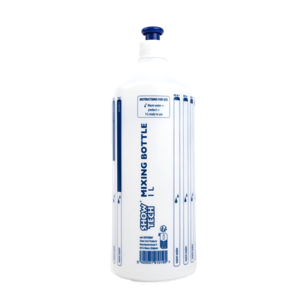 Plastenka za mešanje šamponov in regeneratov volumna 1L, ki vsebuje različna mešalna razmerja za natančno doziranje koncentriranih izdelkov.