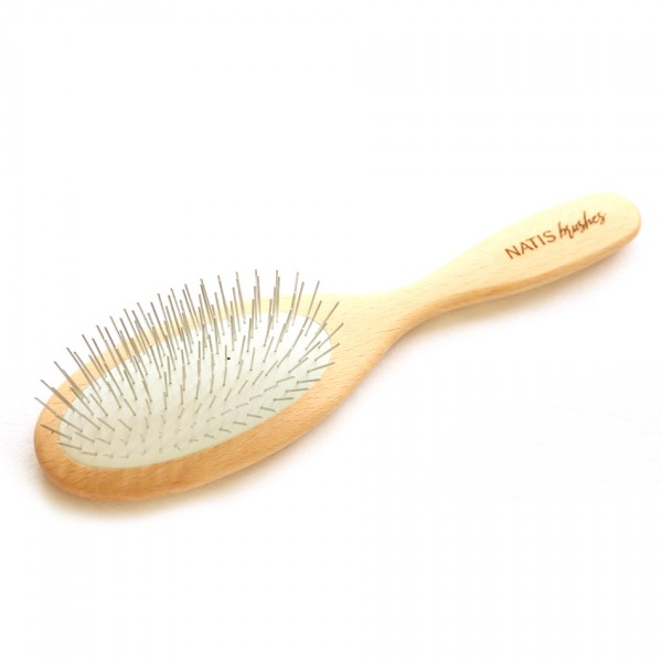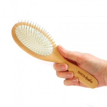 Ta odlična krtača je izdelana v Evropi za našo lastno blagovno znamko NATIS®. Lahka lesena konstrukcija bo poskrbela za nemoteno česanje in ne bo dodatno obremenjevala roke. Čvrsta a mehka guma, ki drži iglice (pine), skrbi za učinkovito prečesavanje različnih tipov dlak.