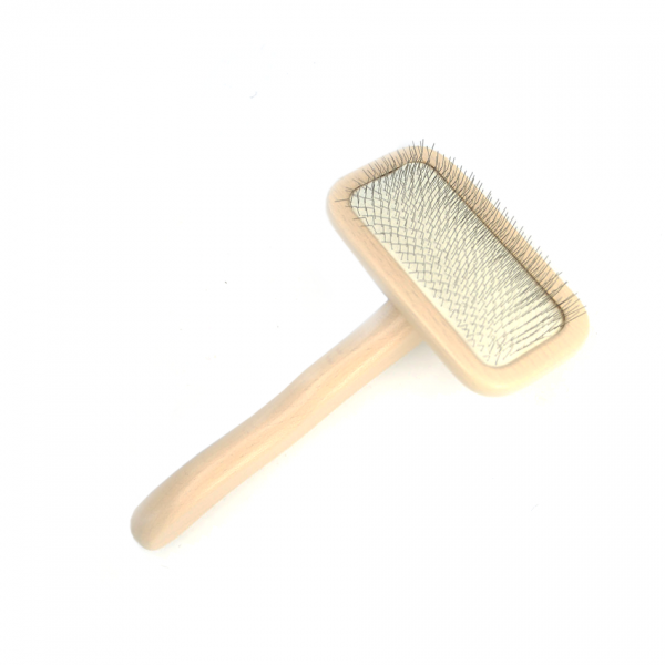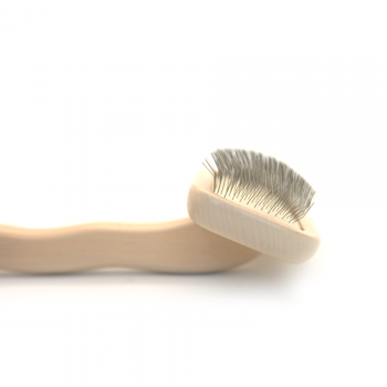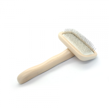Ta elegantna lesena slicker krtača je idealna za razčesavanje vseh tipov dlak. M velikost glave in srednje dolge iglice so vpete v mehki blazinici, ki skrbi, da ta krtača ni pregroba in zato ne trga dlake.