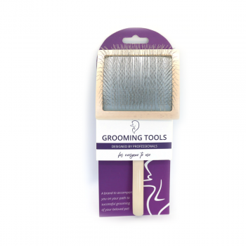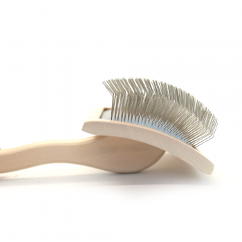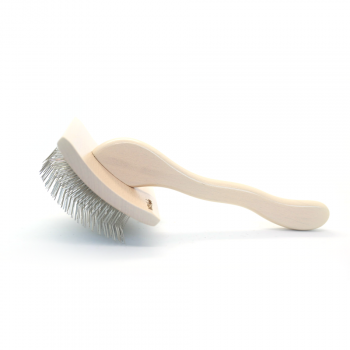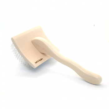 Ta oglata lesena slicker krtača je idealna za razčesavanje gostih kožuhov. Ima zakrivljeno glavo, ki poveča površino česanja in se sklada z našimi potezami krtačenja. XL velikost glave in izredno dolge iglice, ki so vpete v mehki blazinici, skrbijo, da ta krtača ni pregroba in zato ne trga dlake.