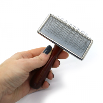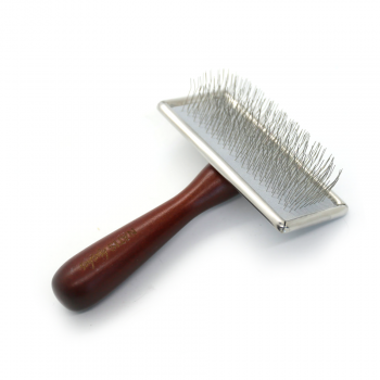 Čvrste iglice te klasične slicker krtače skrbijo za učinkovito česanje tudi bolj trde/resaste dlake, še vedno pa je dovolj mehka, da ne poškoduje svilnate/mehke dlake. Dovolj dolg ter hruškasto oblikovan ročaj iz lesa je udoben za česanje. Vpet je v kovinsko pravokotno glavo, ki ima čvrsto blazinico s srednje dolgimi iglicami.