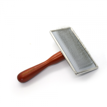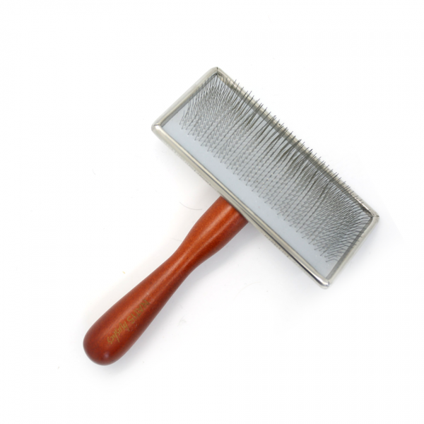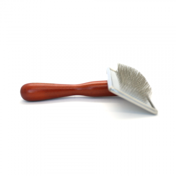 Čvrste iglice te klasične slicker krtače skrbijo za učinkovito česanje tudi bolj trde/resaste dlake, še vedno pa je dovolj mehka, da ne poškoduje svilnate/mehke dlake. Dovolj dolg ter hruškasto oblikovan ročaj iz lesa je udoben za česanje. Vpet je v kovinsko pravokotno glavo, ki ima čvrsto blazinico s kratkimi iglicami.